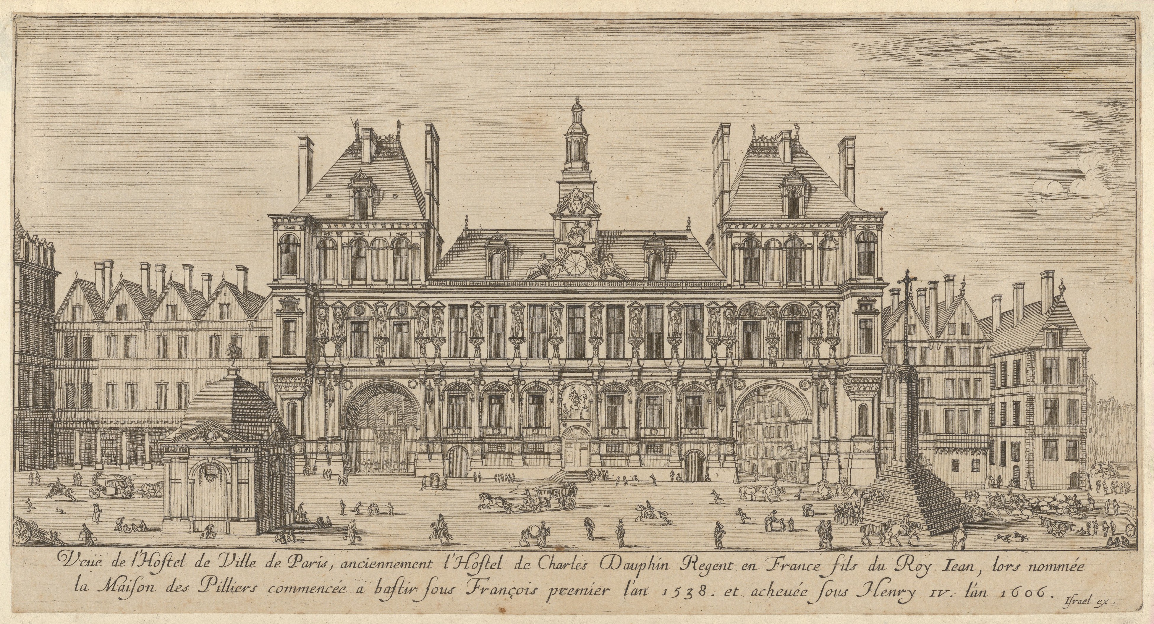 — l. HOSTEL DE VILLE DE PARIS (Veuë de l') anciennement l'Hostel de Charles Dauphin Regent en France fils du Roy Jean lors nommée la Maison des Pilliers commencée à bastir sous François premier l'an 1538 et achevée sous Henry IV l'an 1606. — Israel ex. — (H : 133 - L : 251).